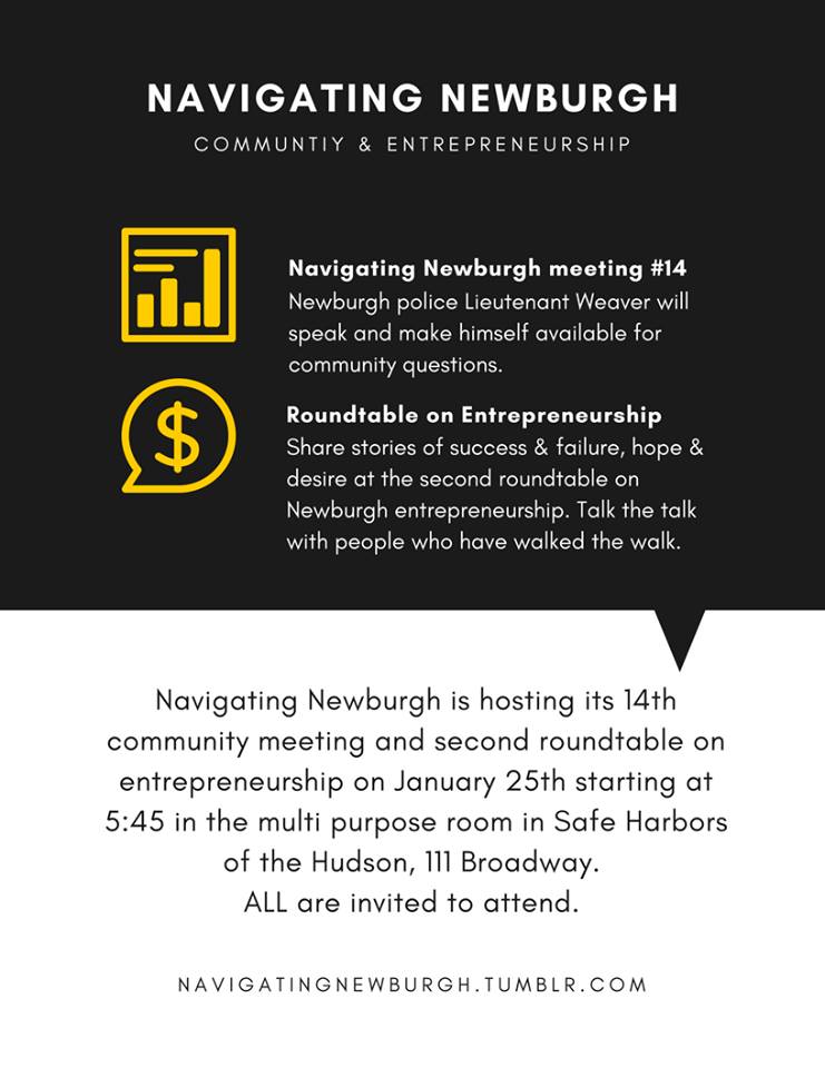 During the January 8th Council meeting in the wee hours of a very long meeting a few of the council members mentioned they are open to a discussion and development of a plan focusing on Economic development. I want to answer that request and commit myself to providing an environment for those discussions to begin. Until a more formal structure can be implemented, I can’t think of a better use for the Navigating Newburgh meetings. So let’s start a dialogue.I invite all business owners, all Entrepreneurs, to sit together with me Thursday, January 25th to brainstorm on what Newburgh can do to support its local businesses and how to attract new businesses to call Newburgh home. I want to identify the problems and start a process of finding solutions.